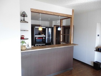 リビングとキッチンの間にあるたれ壁、廊下側のサイドの壁を撤去し、明るく開放的になるようなプランをご提案しました。無垢の柱を使い、床の色に合わせて塗装しカフェのような雰囲気を演出しました。柱の出っ張りを利用した飾り棚には、お気に入りの雑貨を飾っていただいています。