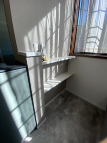 また、キッチンのレンジフード背面に固定棚を新設しました。