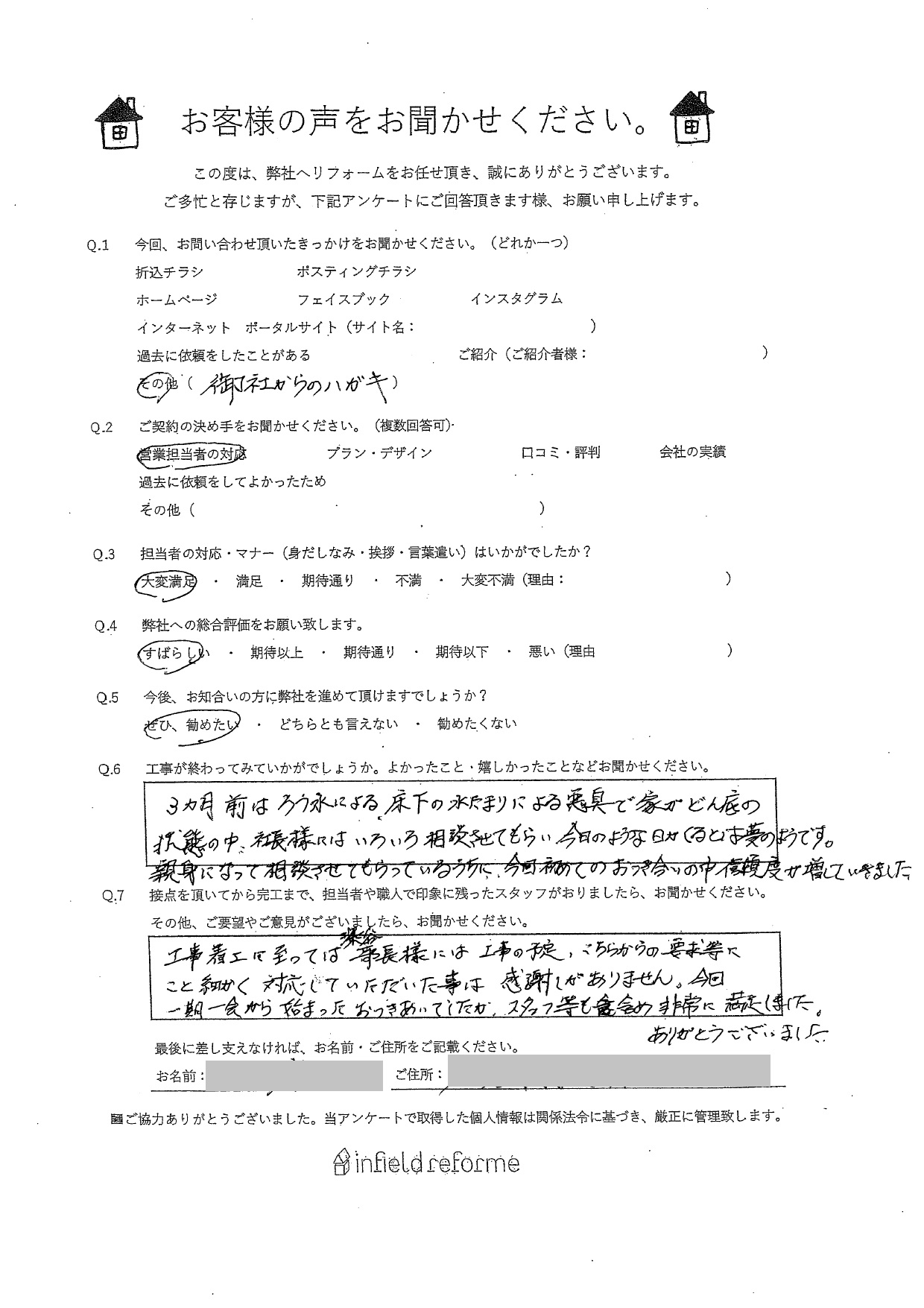 3か月前は漏水による、床下の水たまりによる悪臭で家がどん底の状態の中、社長様には